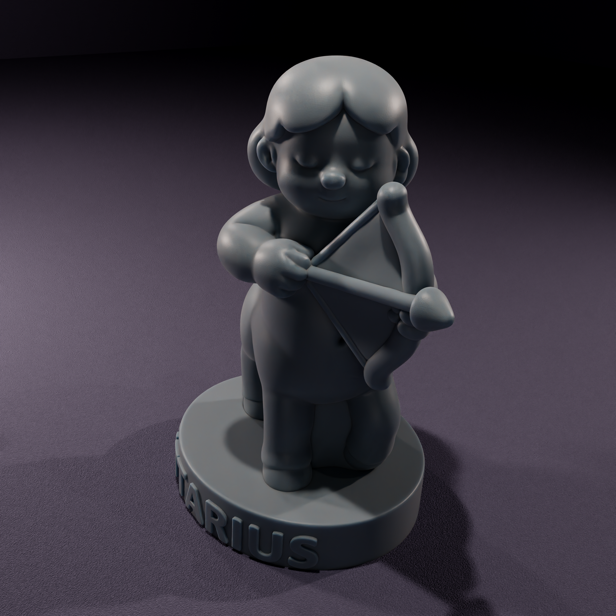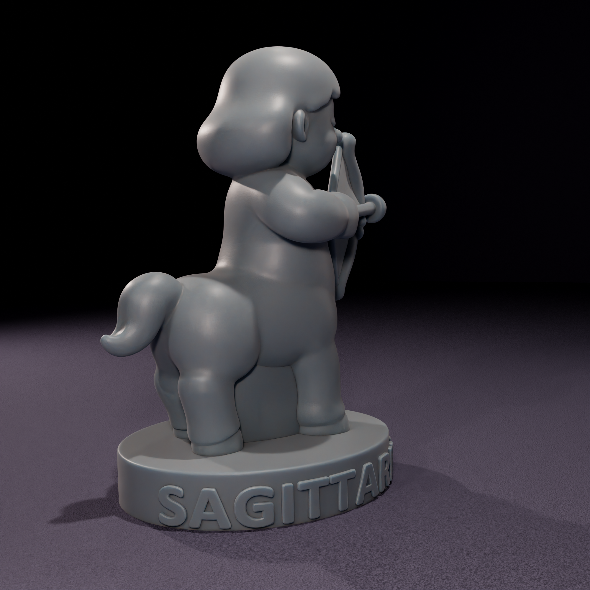 Chibi figure of the Sagittarius sign, represented as a childlike and tender-looking centaur. The upper body corresponds to a boy with short, straight hair, while the lower body is that of a sturdy horse. The figure holds a bow and arrow in a shooting position, a characteristic symbol of the sign. The circular base supports the piece and bears the word SAGITTARIUS inscribed in capital letters. It was designed to be used as a candle mold.