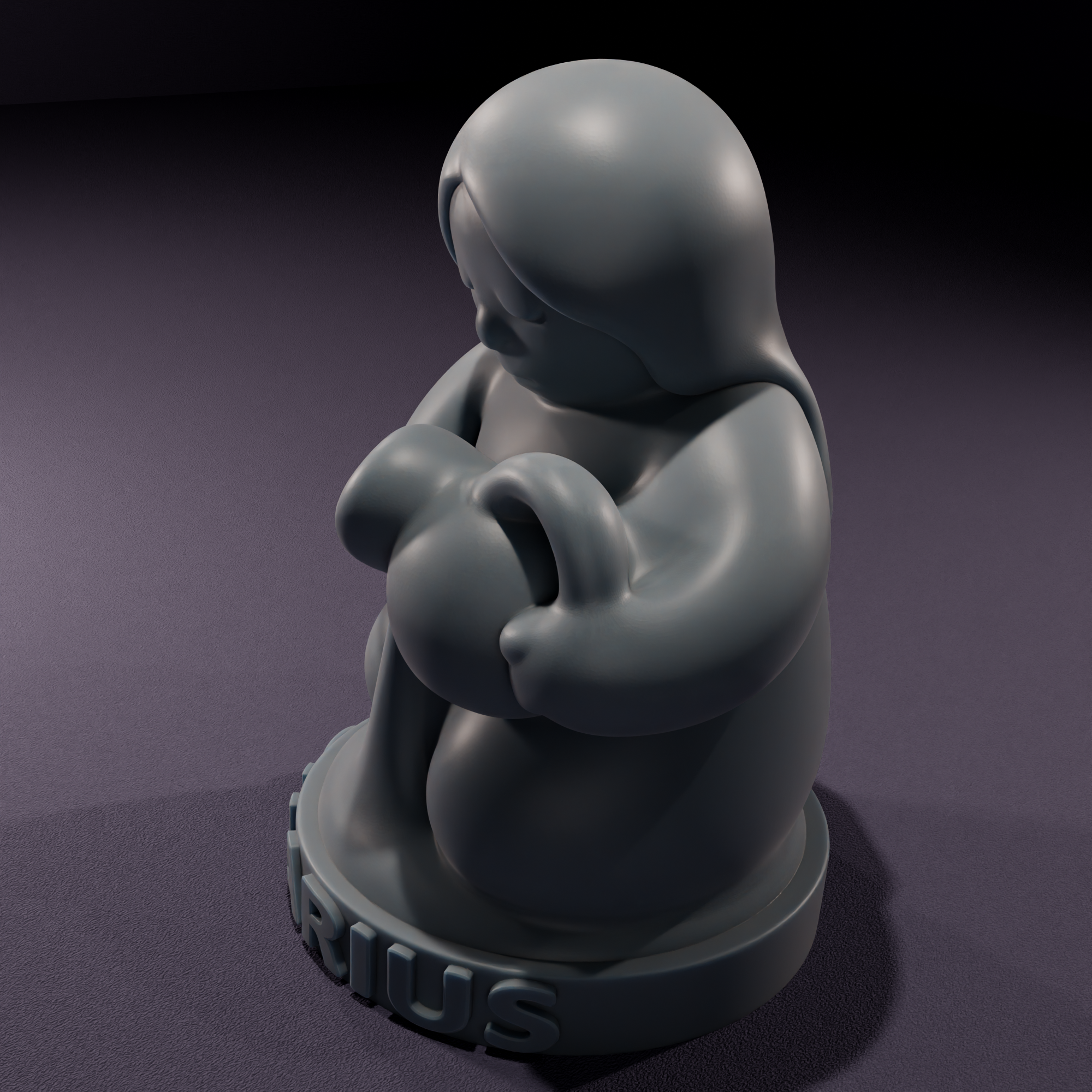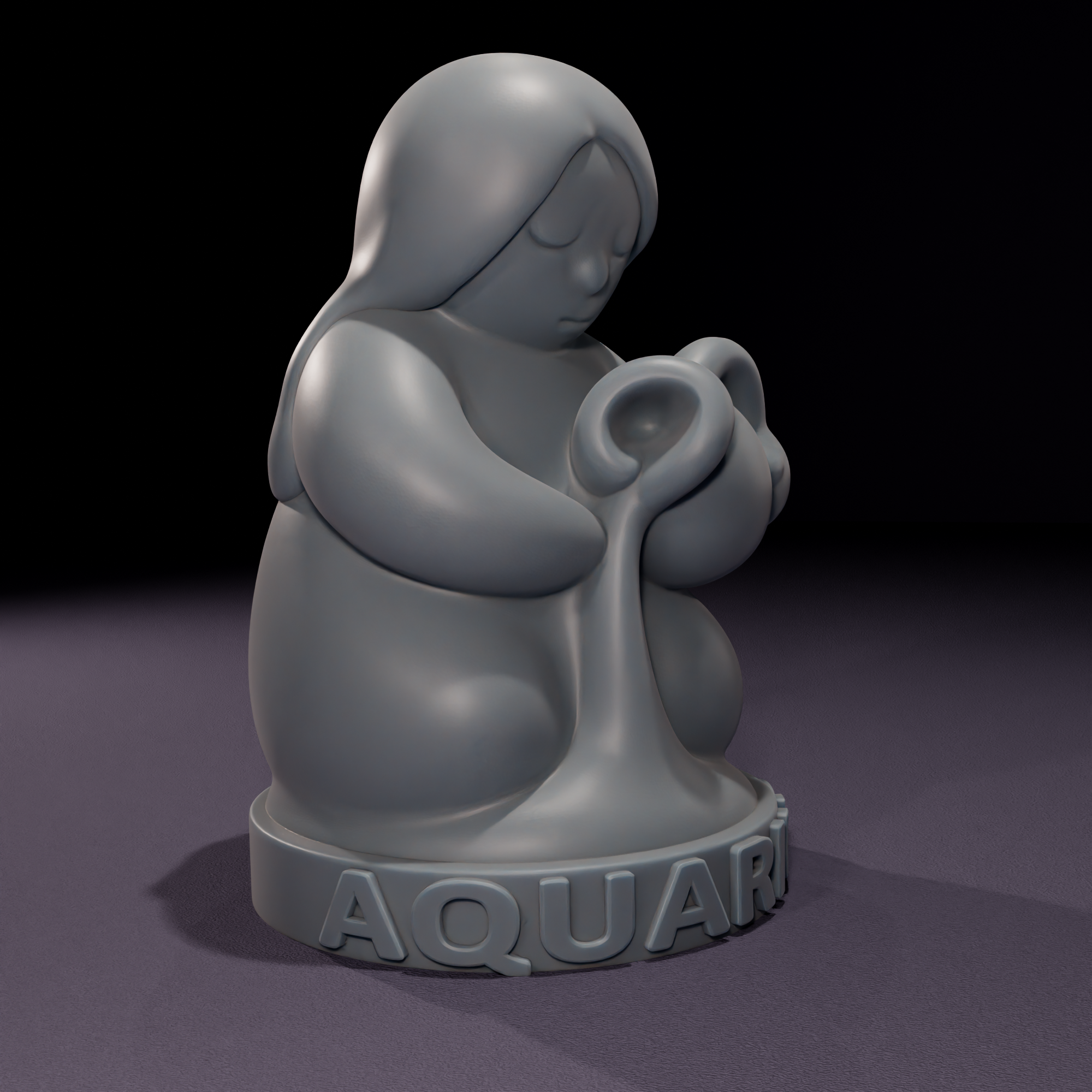 A chibi figure of the Aquarius sign, featuring a woman with straight hair. She holds a large, ornate vase in both hands, from which a stream of water falls. The circular base bears the inscription AQUARIUS and was designed to serve as a candle mold.