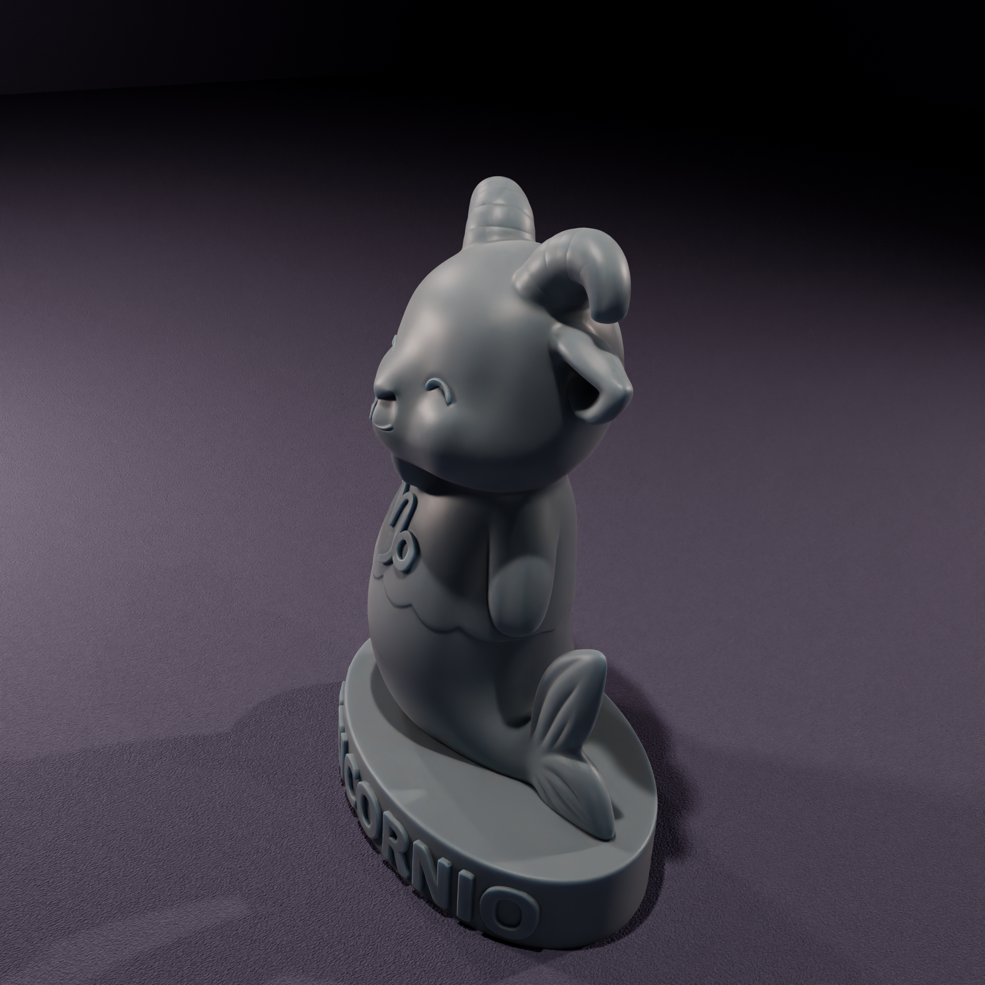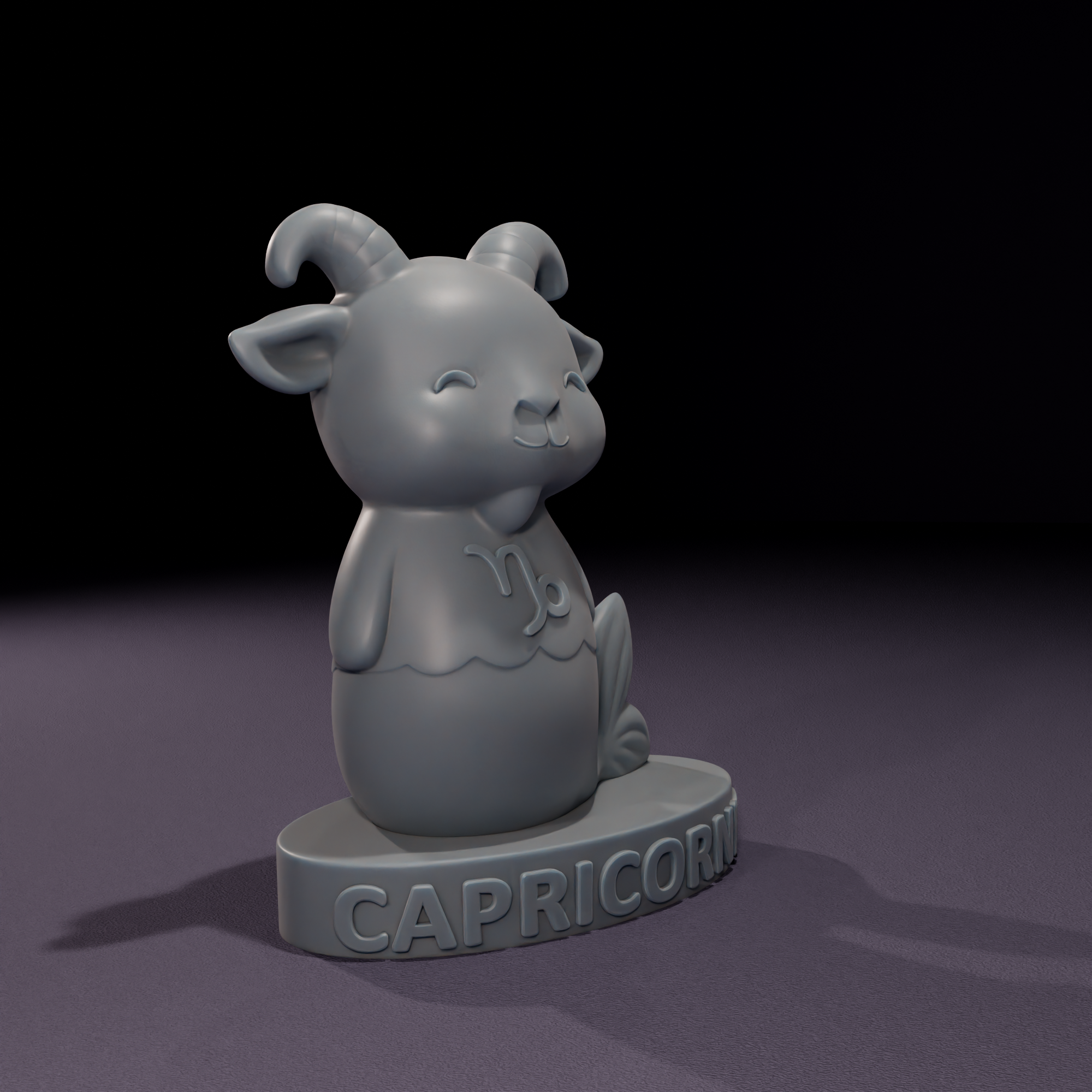 Figura chibi del signo Capricornio, con forma de cabra de cuernos curvos cuya parte superior es de cabra y la inferior se transforma en una elegante cola de pez. En el pecho lleva el símbolo zodiacal de Capricornio en relieve.En la base circular de la figura está escrito en mayúsculas la palabra CAPRICORNIO. Esta figura fue creada con la intención de convertirse en molde de vela.