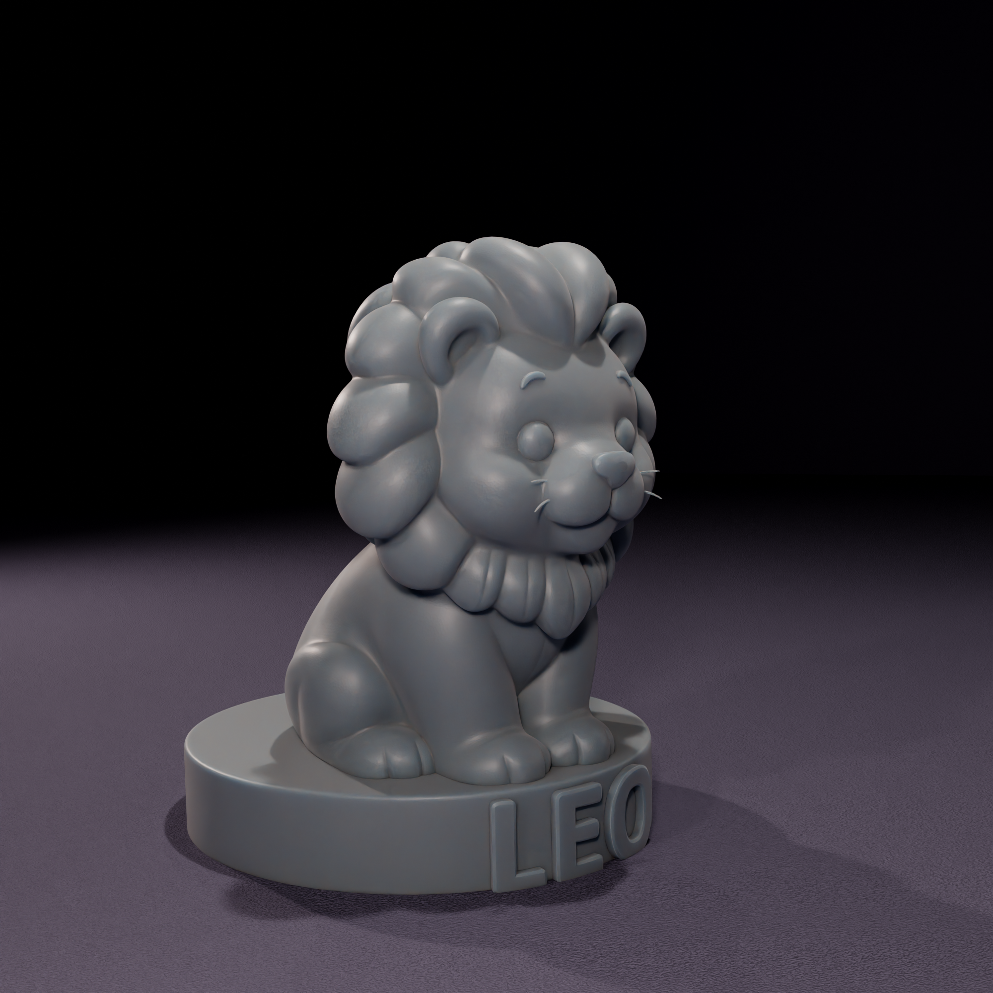 Figura chibi del signo Leo, con forma de león de aspecto simpático, melena abundante y cuerpo redondeado. El diseño mantiene un acabado liso y uniforme. En la base circular de la figura está escrito en mayúsculas la palabra LEO. Esta figura fue creada con la intención de convertirse en molde de vela.